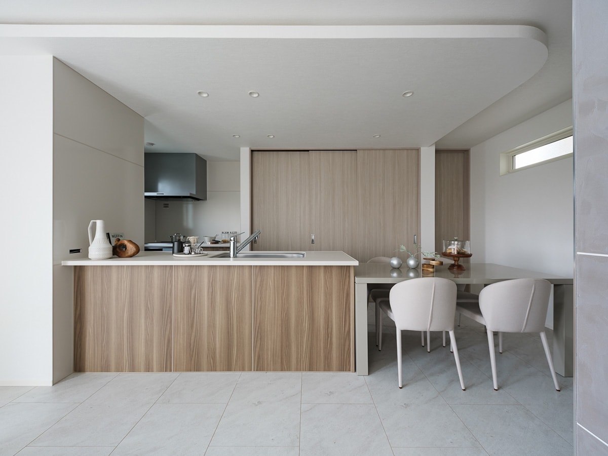 DKは角Rの造作天井でさりげないゾーニングを…。天井のカラーや素材を変えずに、間接照明を組み込んで立体感や上質感を感じさせる空間演出を施しました。