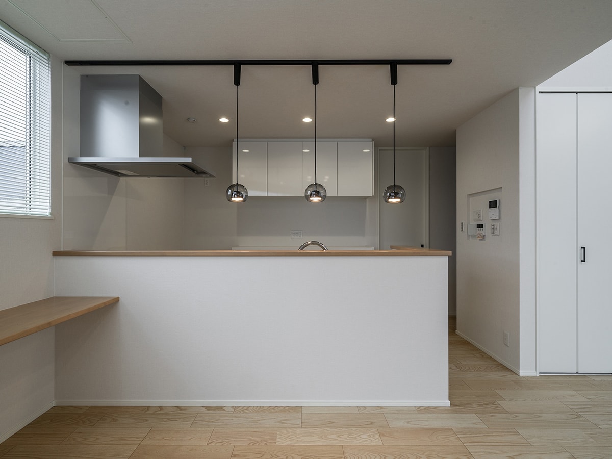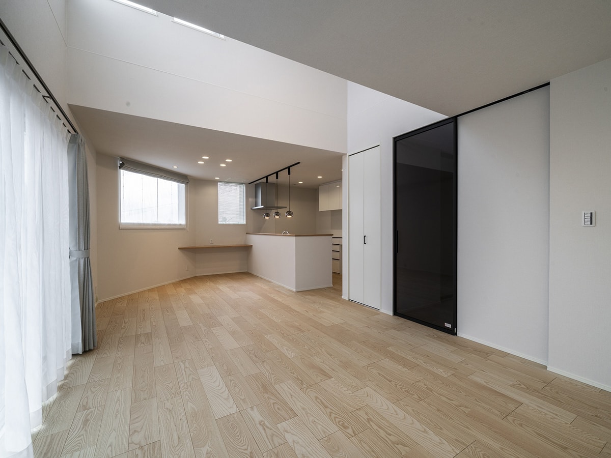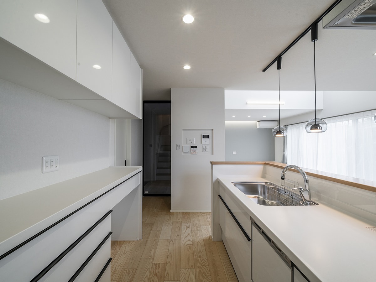 玄関のSCLから洗面・脱衣・浴室へと一直線。ホールからパントリー経由でキッチンへ。まさに効率重視の“神”動線プランです。高窓から陽光注ぐLDKの吹き抜けにも注目!!