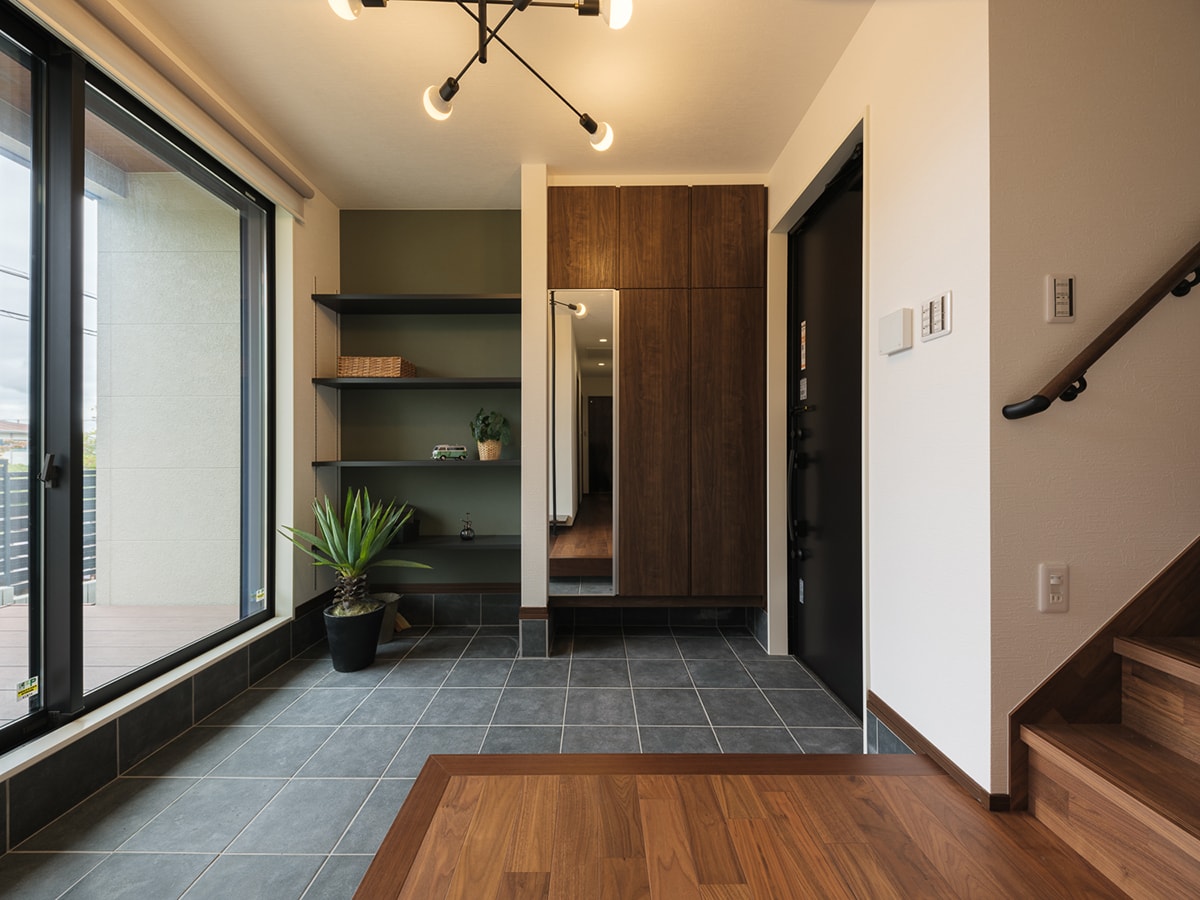 ウッドデッキや裏庭と繋がる玄関の土間スペースは多目的空間。