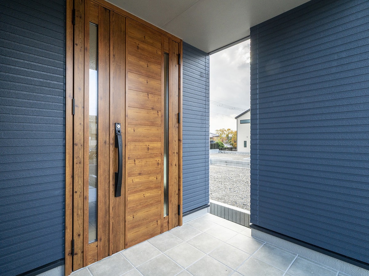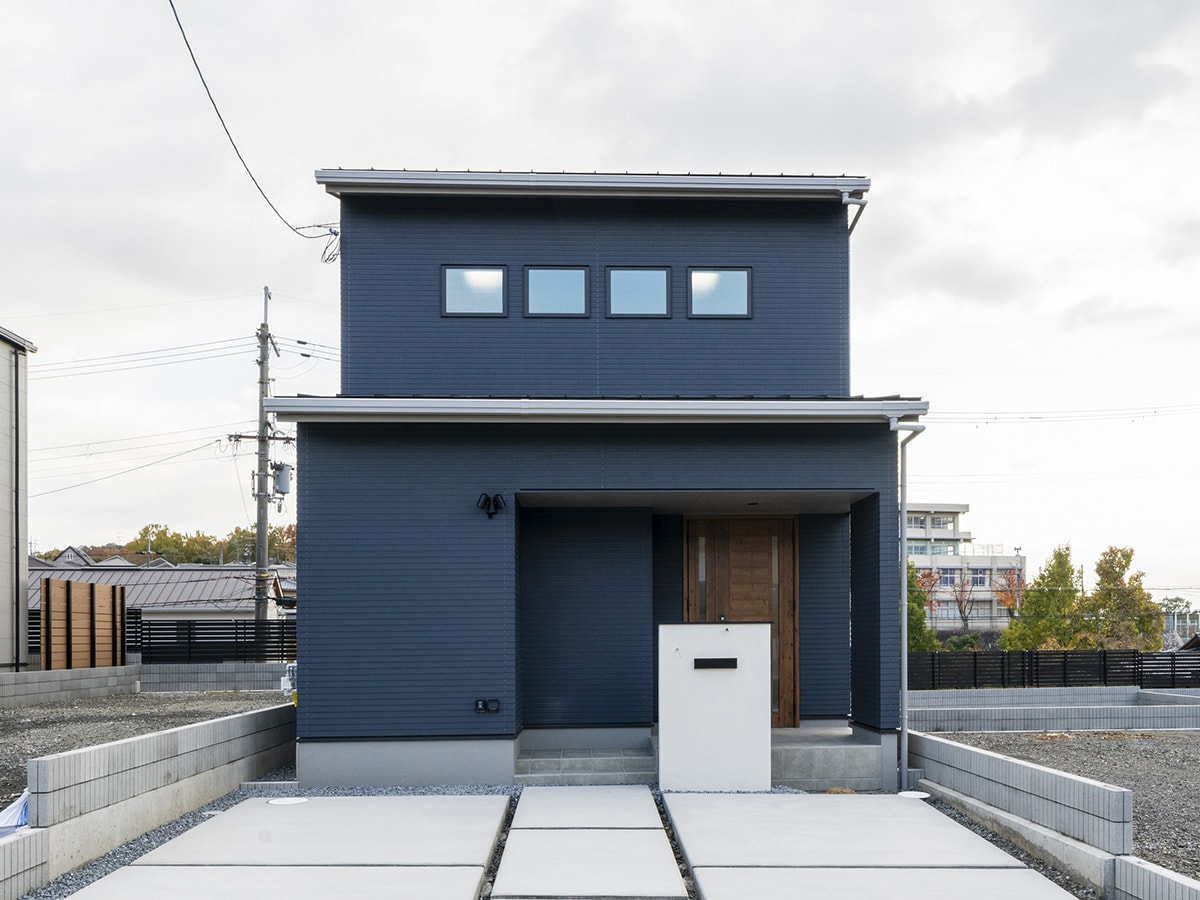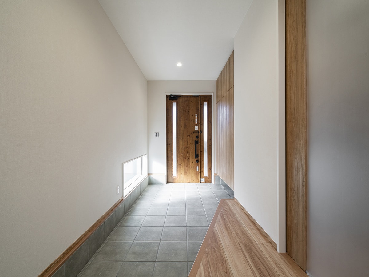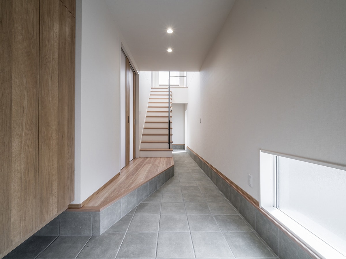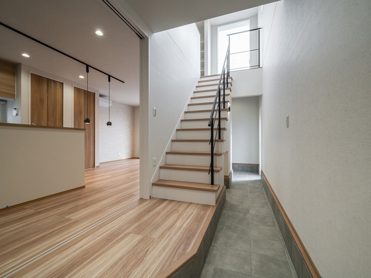 玄関を入ると吹き抜けの通り土間が出迎えてくれます。リビング南側に設けた大きなウッドデッキや、2階ホールのカウンター付きベンチもポイントです。