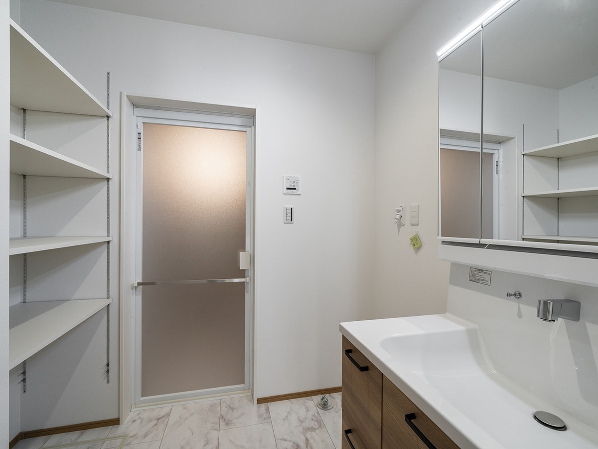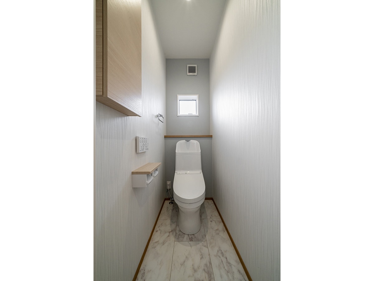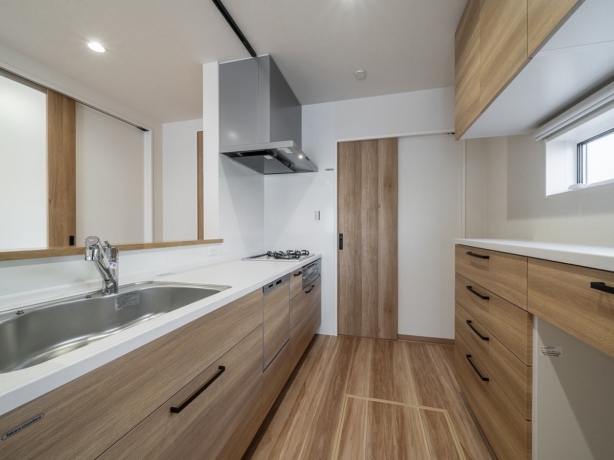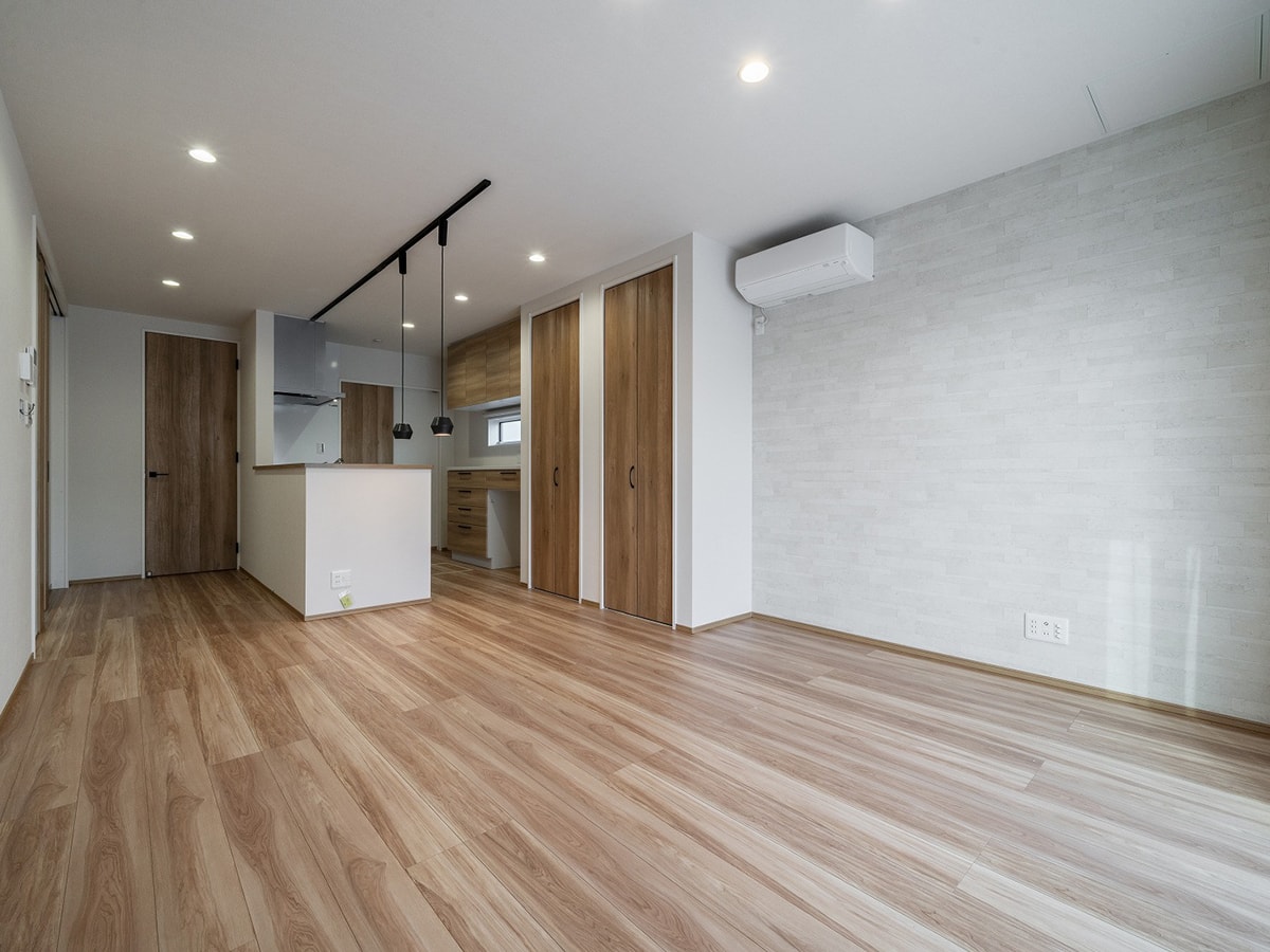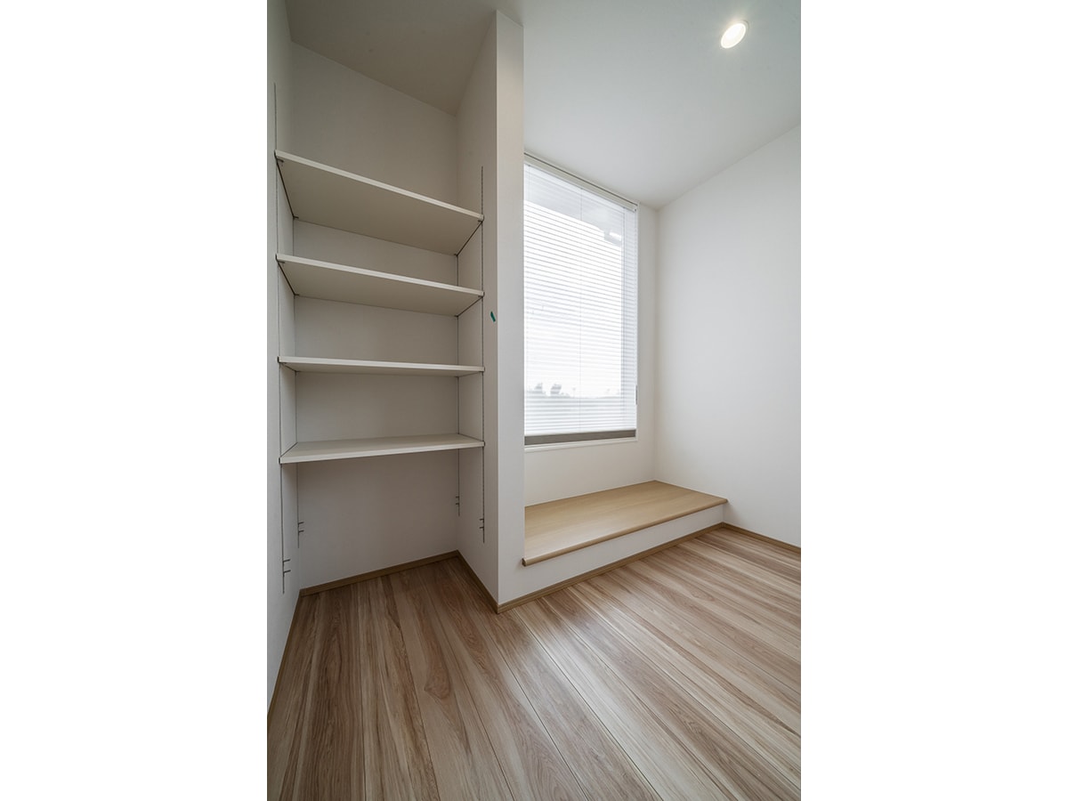 玄関を入ると吹き抜けの通り土間が出迎えてくれます。リビング南側に設けた大きなウッドデッキや、2階ホールのカウンター付きベンチもポイントです。
