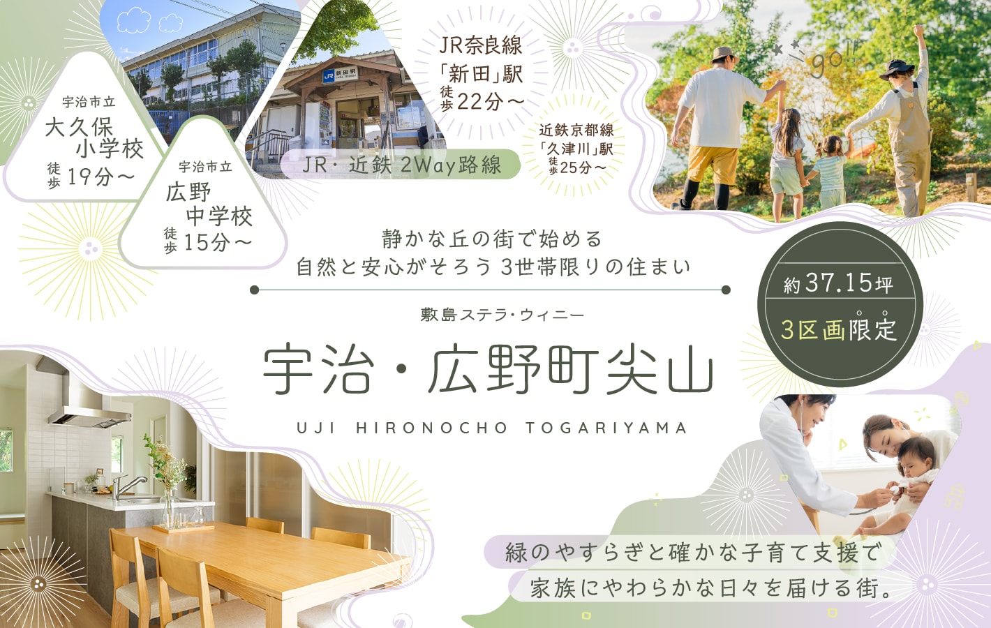 JR奈良線「新田」駅と近鉄京都線「久津川」駅の2way。静かな丘の街で始める、自然と安心がそろう3世帯限りの住まい。