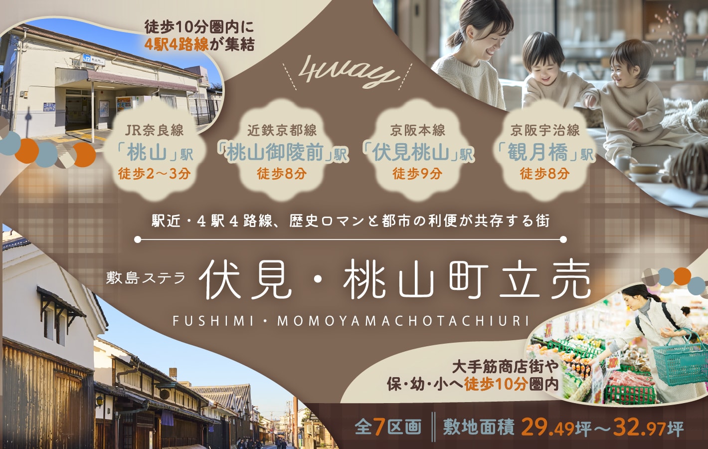 徒歩10分圏内に4駅4路線が集結した利便の地、京都・桃山。歴史と静寂が調和する、家族のための7区画の新しい住まい。