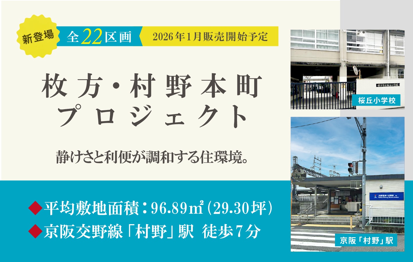 京阪交野線「村野」駅 徒歩7分。静けさと利便が調和する住環境。都心へ快適に、毎日の暮らしも心地よく。 枚方・村野本町プロジェクトページへ≫