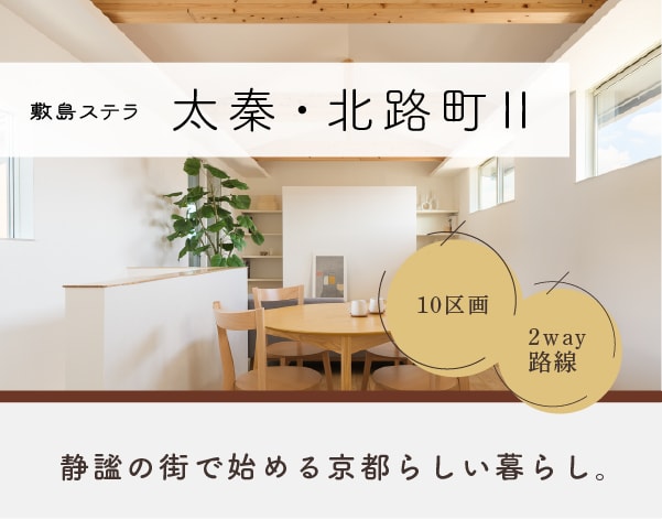 「ガーデンテラス太秦北路町」は全8区画の新しい街。1号地から4号地までは自由設計街区。そして5号地から8号地が、敷島住宅として価値ある住まいと暮らし方を合わせてご提案するこのコンセプト街区です。敷地面積は36坪から47坪とゆとりある全4区画。この家ではこんな暮らし方をして、豊かな時間を過ごしていただきたいという想いを込めて、全てのプランに第三の空間を設け、新たな価値をプラスしました。